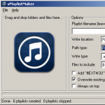 Description: sPlaylistMaker allows you to easily create .m3u and .m3u8 playlists via drag-and-drop. sPlaylistMaker supports Unicode characters and offers several playlist writing options: